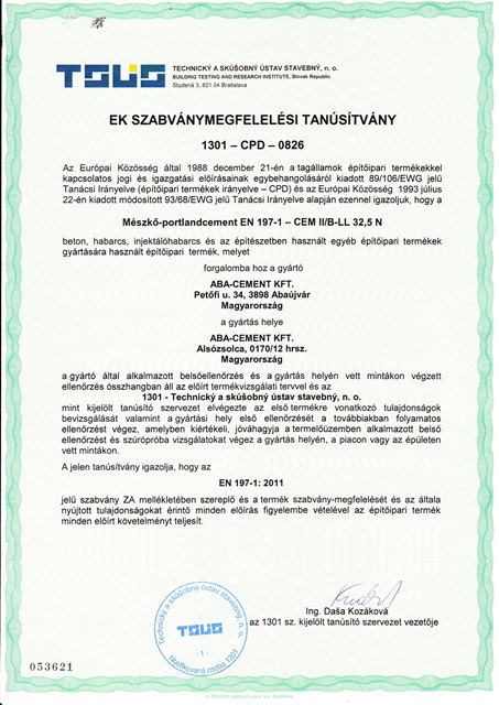EK Szabványmegfelelési tanúsítványunk száma 1301-CPD-0826